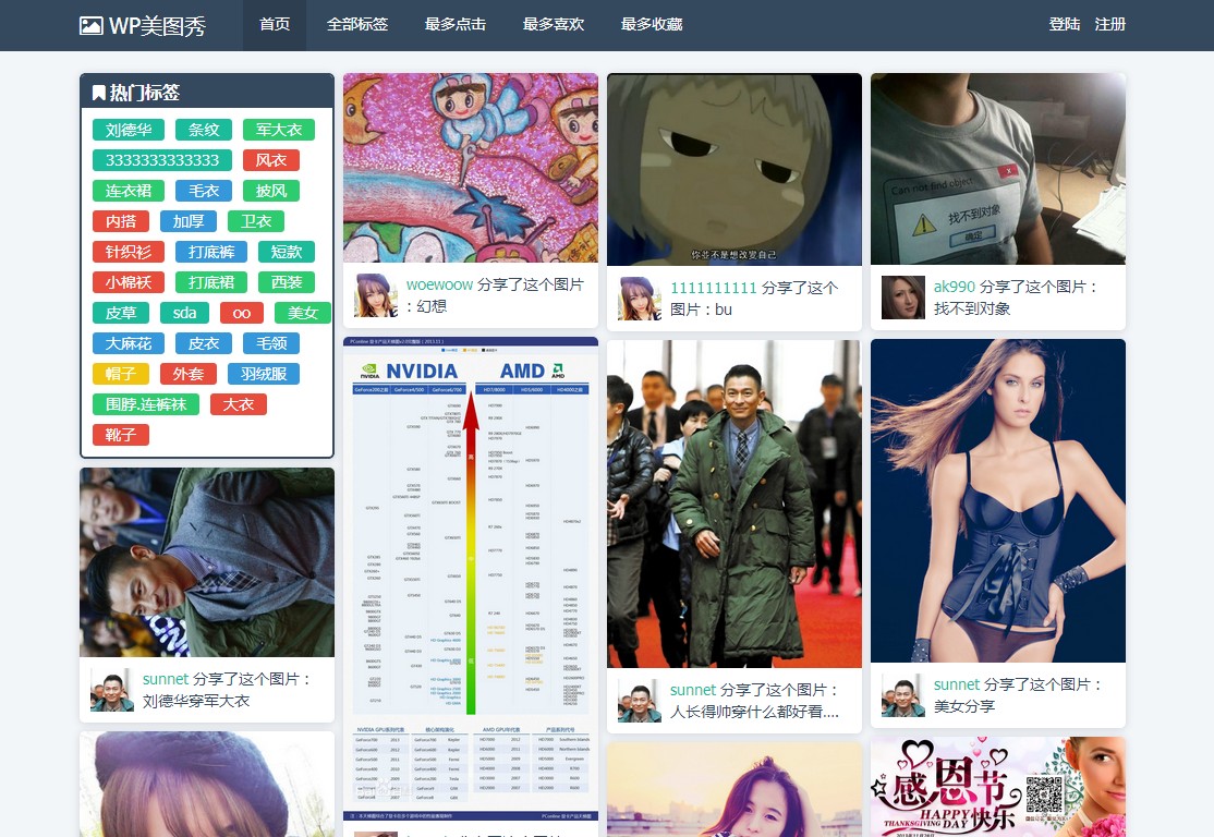 大家还在找图片主题?淘宝客主题吗?今天这款wordpress主题:美图将能够满足大家是需求,从直接效果来看,作为图片分享类主题是完胜,如果稍加修改,比如加个购买链接的话,那么作为淘宝客主题也将完胜,首先,他是一款瀑布流主题,其次,他是一款拥有强大用户中心系统的主题,可以让用户自由注册、发布、分享信息,肿么样,够强大了么?